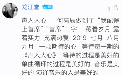 腾讯音乐娱乐声入人心金曲榜首期榜单中排名第三的何亮辰,节目中经历了“请教”与“被请教”的轮回后,被确认首席。他在《不会成真的梦》和《Cortigiani,vil razza》两首曲目中的发挥都展现出惊人的演唱实力。QQ音乐用户“QDX”评价《不会成真的梦》道:“何亮辰的演唱出口便抓人,第一时间内就展现了浑厚的男中音本质”。