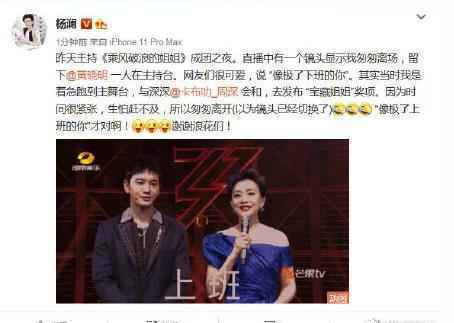 之后杨澜在社交平台上发文回应道:昨天主持《乘风破浪的姐姐》成团之夜,直播中有一个镜头显示我匆匆离场,留下黄晓明一人在主持台。网友们很可爱,说:"像极了下班的你”。其实当时我是着急跑到主舞台,与周深回合,去发布“宝藏姐姐”奖项。因为时间很紧张,生怕赶不及,所以才匆匆离开(以为镜头已经切换了)“像极了上班的你才对啊谢谢浪花们!”同时还晒有表情包,也是很有趣。