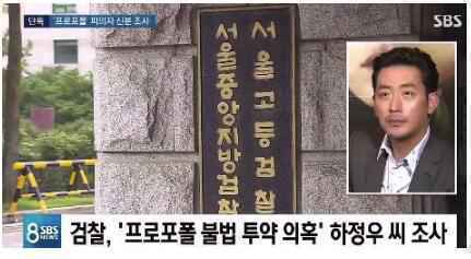 韩国警方以河正宇为对象,追查了其涉嫌在首尔江南某整形医院外科非法使用名为“牛奶注射(异丙酚)”的睡眠麻醉剂的事件。特别是对河正宇以亲弟弟与经纪人等2位的名义去使用异丙酚的原委也进行了调查。