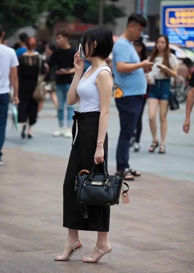 其实,半身裙就是这种穿法,一般都会利用其束腰的优势,不管是搭配短款上衣,还是采用“塞衣角”的穿法,都是为了发挥修饰腰身的作用,不知你是这样的吗?而美女的这身穿搭,不仅展现了时髦个性,而且也同样发挥了半身裙修身塑形的效果,利用黑色有显瘦的优势,然后搭一件白色的背心,营造一种“黑白配”的既视感,说来说去,还是为了起到吸引注意力的效果,才有利于展现自己的曼妙身姿。
