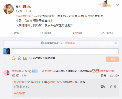 8月8日,景甜微博官宣,将要在天猫国际开一家小店,不到半小时就引发数万粉丝热议。作为国内炙手可热的大明星,景甜一直活跃在各类影视作品中,除了粉丝见面会、电影首映礼等互动渠道,粉丝们也希望能够有更多的渠道与景甜亲密接触,拥有一家自己的小店,直播、推荐自己的保养秘籍,无疑成为粉丝深度了解爱豆的又一绝佳场景。