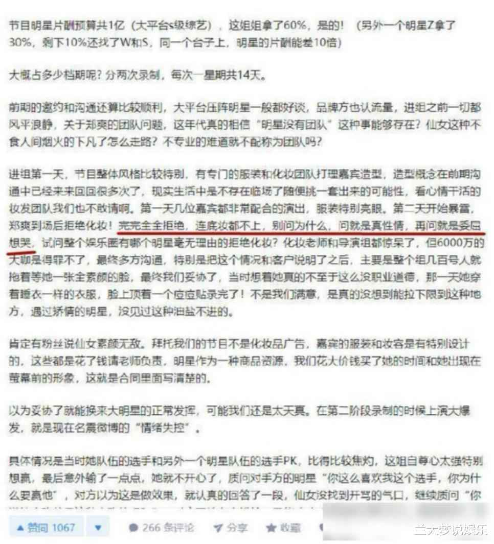 原来观众们觉得,郑爽在参加综艺节目时,面对一些嘉宾间难免遇到的争执,她的表现往往不尽如人意—过于考虑自己的感受而不顾虑其他嘉宾的情绪。像最近她和张一山同时参加了一档选拔节目,因为在录制时不赞同裁判对于自己队员的判定结果,郑爽当场情绪崩溃,当着观众和评委的面大肆宣泄自己的不满。这个情况也让很多人膛目结舌:要知道这档综艺不仅有同辈艺人参与,更是邀请了像张国立这样的演艺圈前辈做主持,在这样的S级综艺上当众不给节目组面子,实在是不太妥当吧。