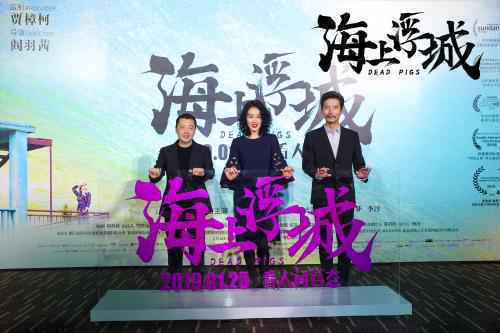 (从左至右)《海上浮城》监制贾樟柯、主演邬君梅、杨皓宇