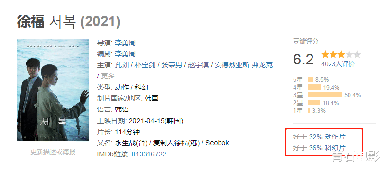 《徐福》的豆瓣开分6.5,如今已经跌到6.2,打分人数还不到5000人,三星占比超过50%,好于32%的动作片,好于36%的科幻片。
