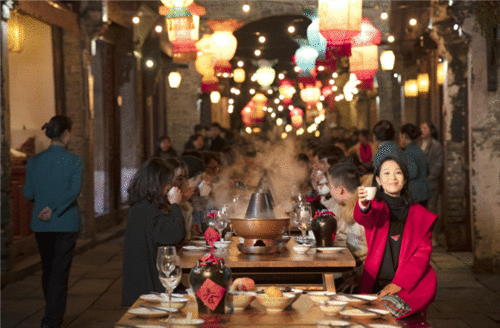 四方桌沿着老街一字排开,认识不认识的游客毗邻而坐,互相说着自己来自天南海北的某个省市,然后彼此道一句“新年好”,方桌上摆着江南特色年菜,一只紫铜暖锅咕噜咕噜冒着热气。看着奶茶热火朝天地吃着暖锅,不知道这长街宴是否也成为臭豆腐、毛豆、竹笋、以及三白酒之后,她又念念不忘的乌镇美食呢?