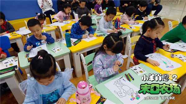 活动一开始,老师向孩子们介绍了《小羊肖恩2:末日农场》的主要剧情及人物,并为孩子们发放画册,组织“小艺术家们”为喜欢的人物填色。接到“任务”的宝宝们雀跃不已,纷纷拿起手中的画笔,开始了天马行空的创作。有趣的是,虽然原著中的“小羊肖恩”只有黑白两种配色,但是孩子们笔下的肖恩却和他们无边的创造力与想象力一样,各色各样,创意无限。谁说没有“五彩斑斓的黑”?孩子们用双手告诉你,肖恩也可以五彩缤纷!